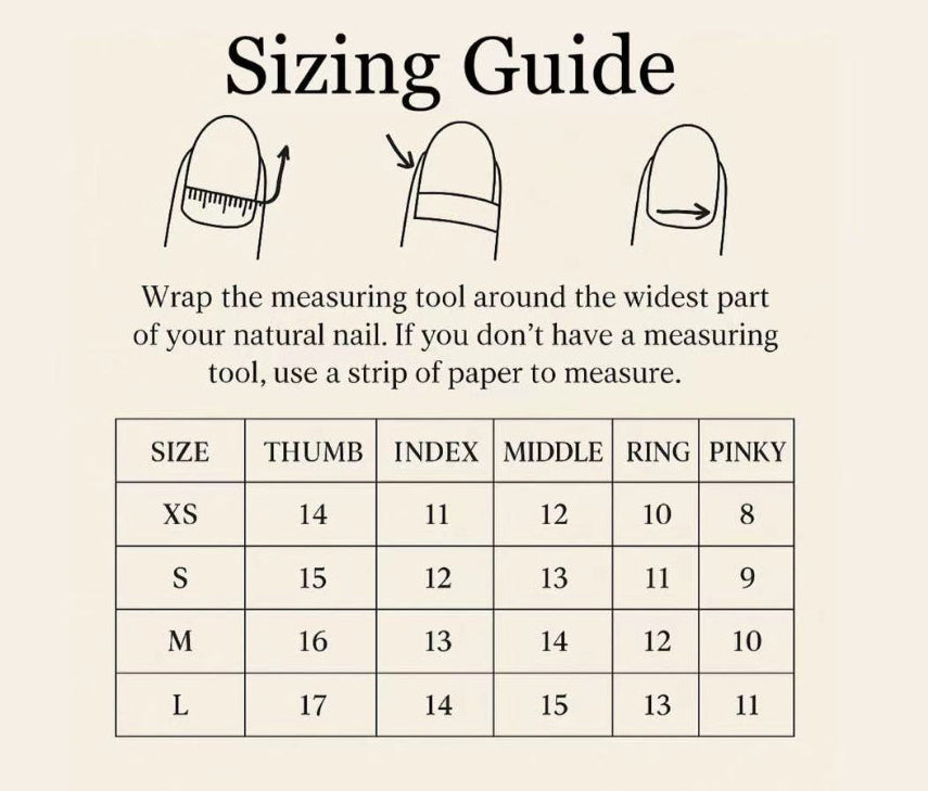 To ensure a natural, comfortable fit, it’s important to measure your nails correctly before placing an order. Use a flexible measuring tape or a strip of paper to measure the widest part of each nail bed in millimeters (mm). Match your measurements with our size chart to select the most accurate size.