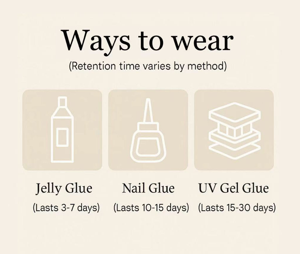 For the best results, we recommend our Handora Beauty UV Gel Glue, which offers a strong, salon-quality hold that lasts 15–30 days and allows for safe removal and reuse. It's all in our Handora Beauty UV Gel Glue Kit, which includes a protective base coat for optimal wear.