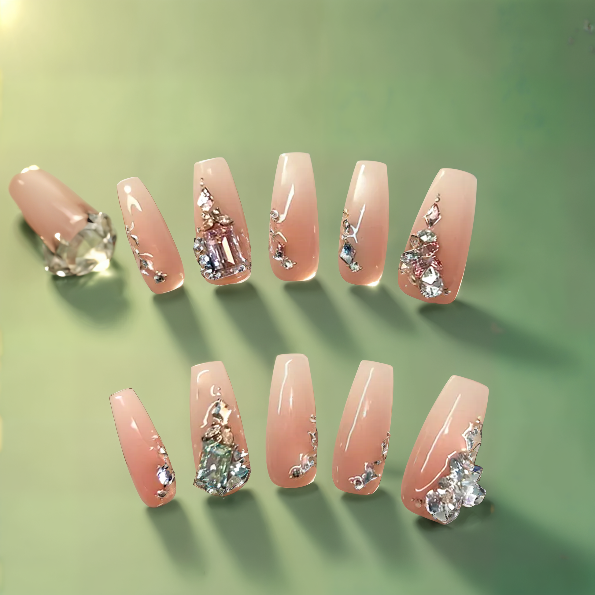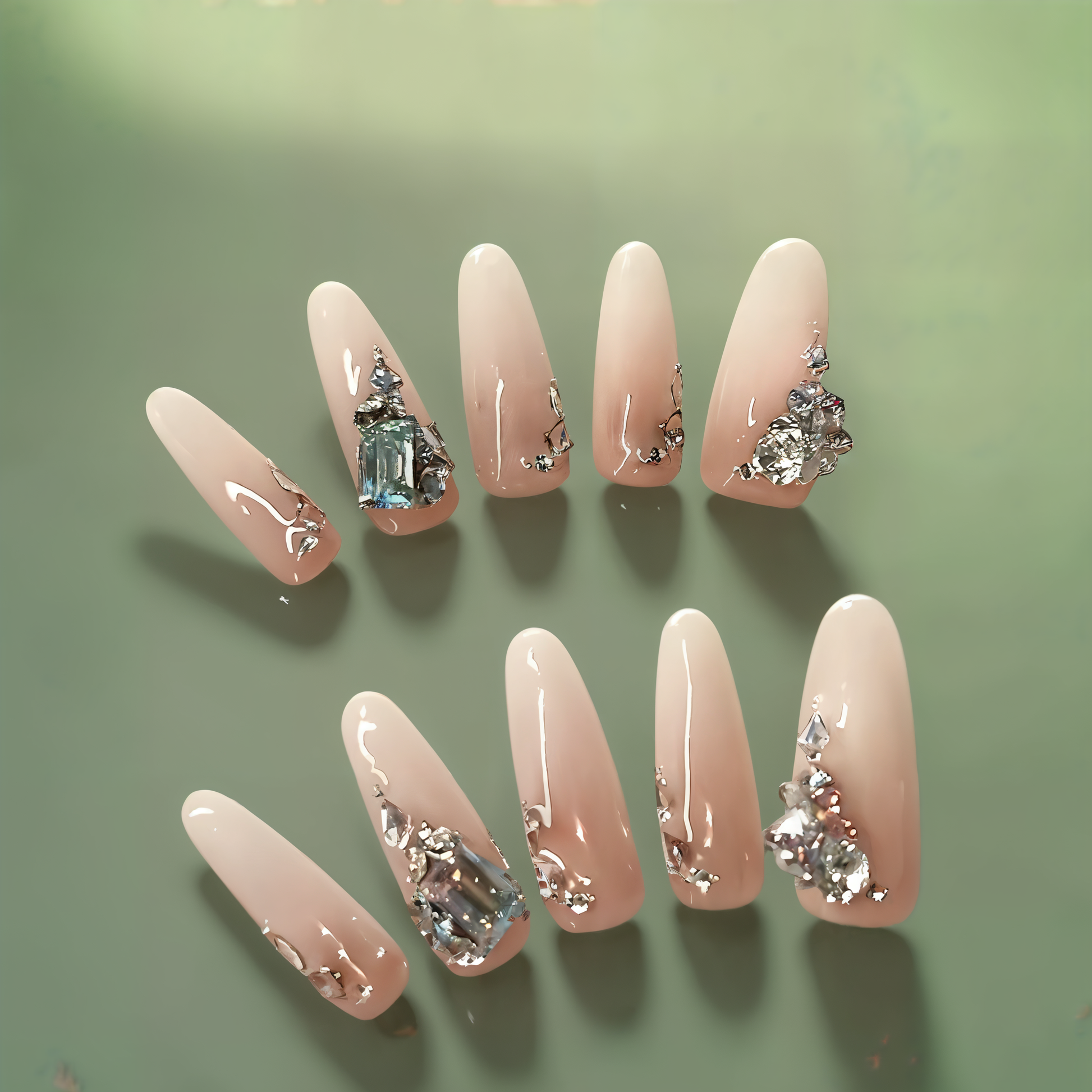 A harmonious duet of color and light, this press-on nail set brings together the gentle romance of blush pink and the serene elegance of powder blue. One hand sparkles with rosy gems, while the other glimmers with icy crystals—creating a soft yet striking visual contrast. Set on a seamless nude ombré base, each nail is adorned with delicate metallic accents and intricately placed stones, capturing the essence of refined balance and modern femininity. Perfect for adding a subtle statement to any occasion.