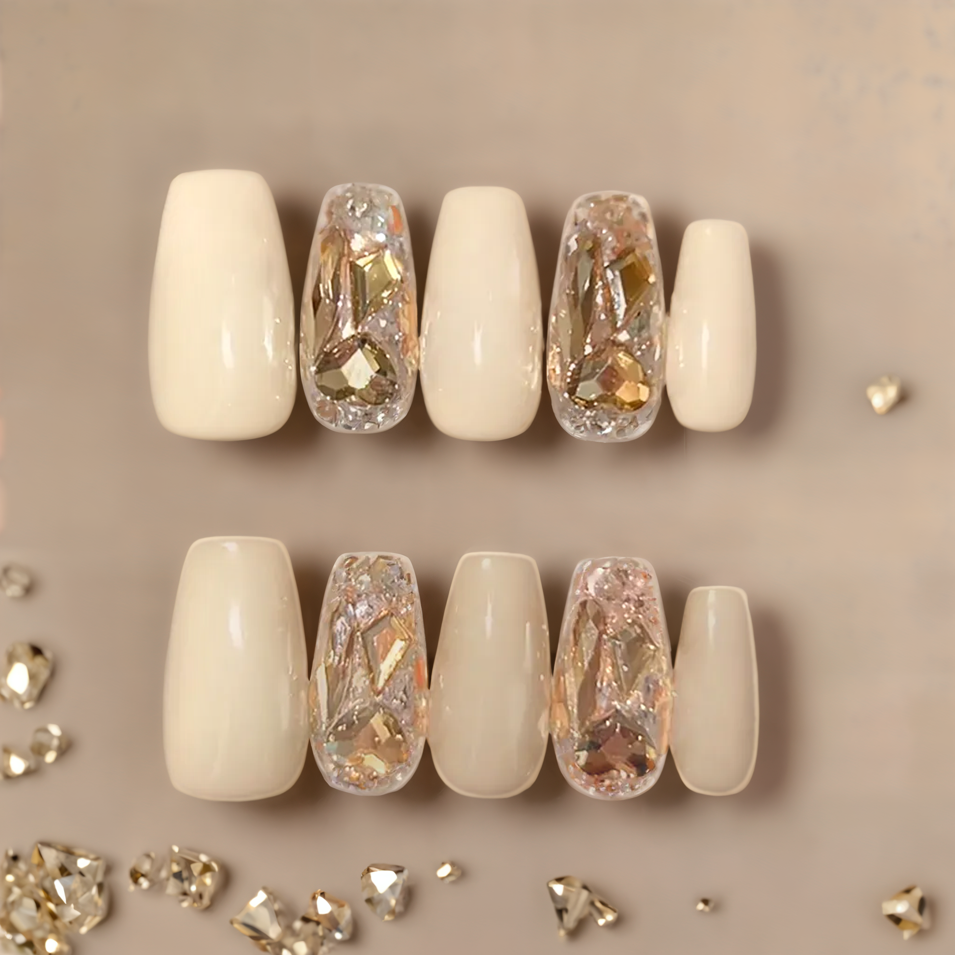 Select accent nails are intricately embellished with high-quality Austrian crystals, carefully selected luxury crystal elements, and brilliantly cut stones, arranged like scattered shards of light within clear, glassy overlays. The result is a minimalist design with maximum visual impact—subtle from afar, dazzling in detail.