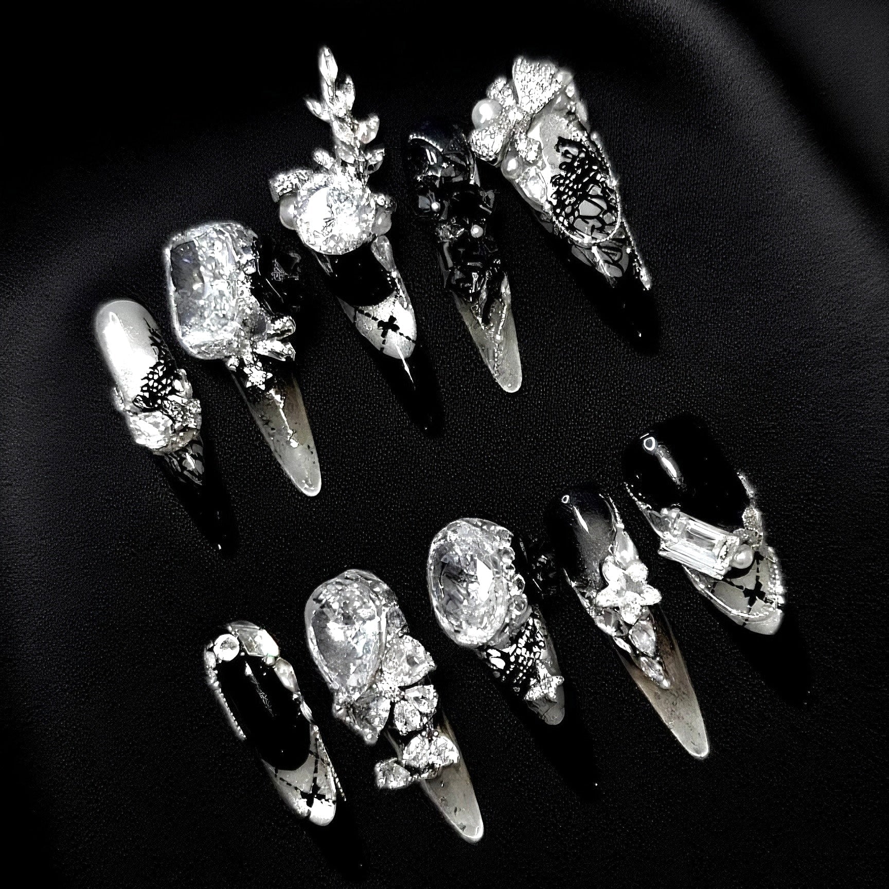 Each nail is crowned with reflective gems and metallic flourishes—some sculpted, some engraved—layered like a veil drawn across a sanctum. Reverent. Rebellious. Radiant.