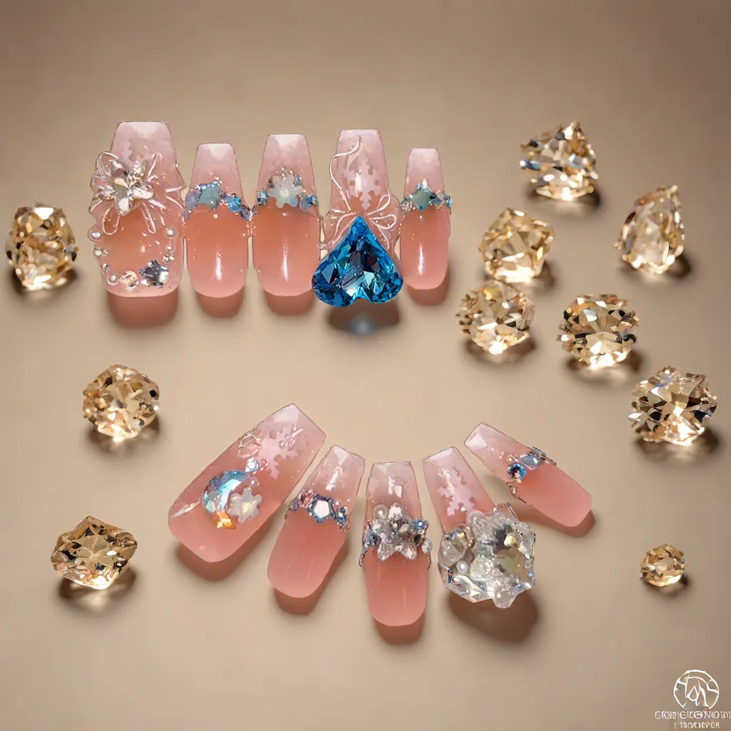 Each nail is embellished with high-quality Austrian crystals, carefully selected luxury crystal elements, and brilliantly cut stones that shimmer with every movement. These premium details add dimension, sparkle, and an undeniable touch of magic to your fingertips.