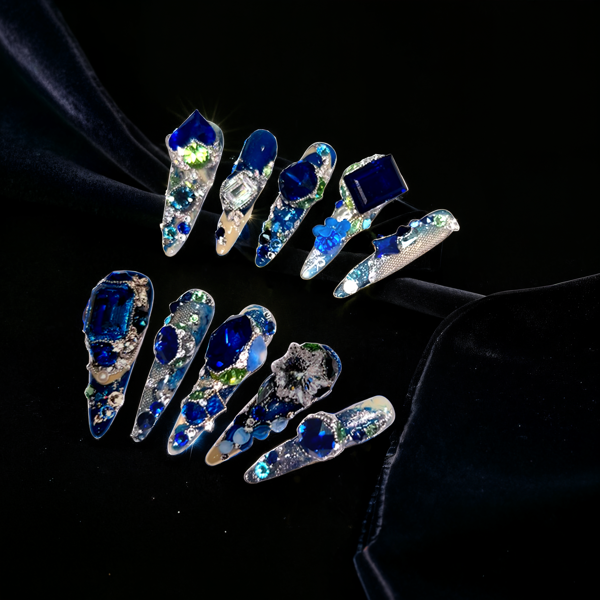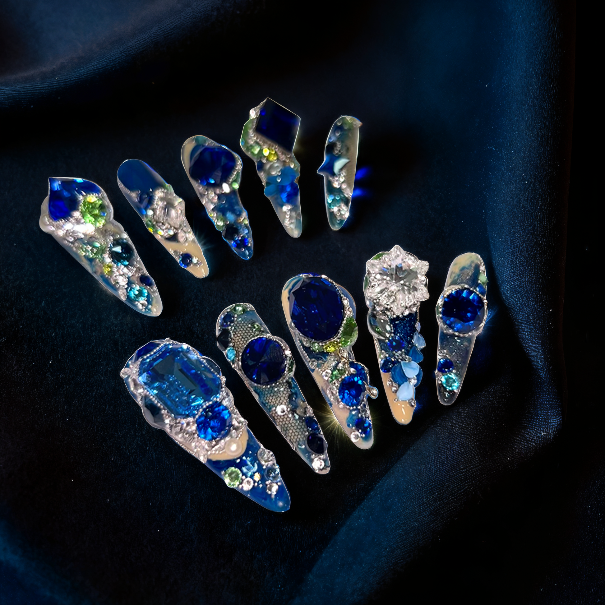 Inspired by the tranquil beauty of the deep blue sea, Oceanic Bliss captures the essence of serenity and opulence. Adorned with radiant blue gemstones, shimmering rhinestones, and intricate silver detailing, these nails create a luxurious, yet calming aura. The combination of sparkling sapphire hues and emerald accents makes this set a perfect statement piece for any special event. Let your fingertips reflect the beauty of the ocean with Oceanic Bliss—a design that radiates elegance and allure.