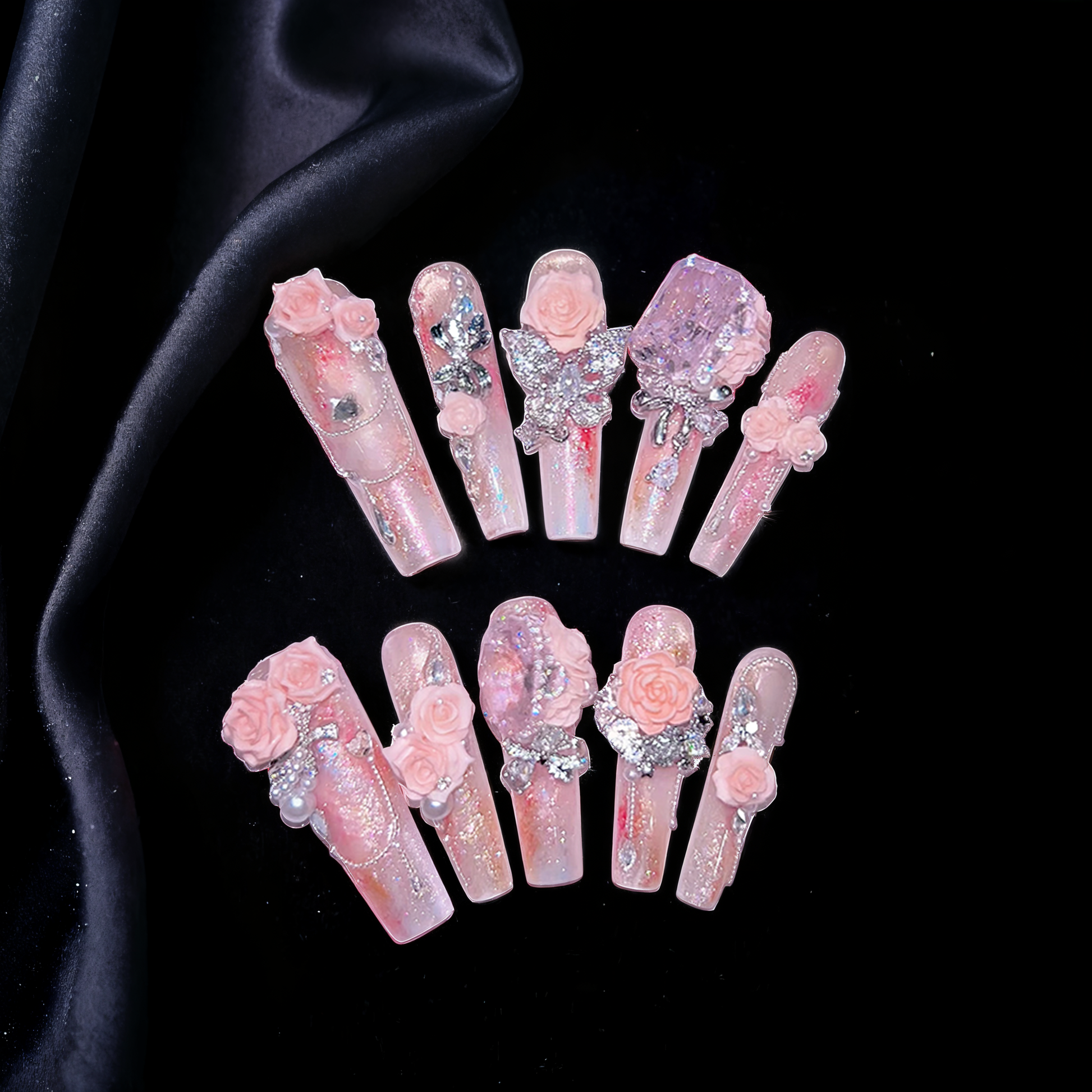 Experience the luxury of royalty with Crown Atelier, a refined collection of handcrafted press-on nails that brings elegance to your fingertips. Rosée Éternelle embodies the essence of timeless beauty, featuring a soft pink base with opalescent shimmer, paired with meticulously placed 3D roses, sparkling rhinestones, and delicate pearls. The addition of statement butterfly gems and luxurious crystals makes this set the perfect choice for those who seek to make a grand statement. Ideal for special occasions, this set offers a majestic touch of glamour.
