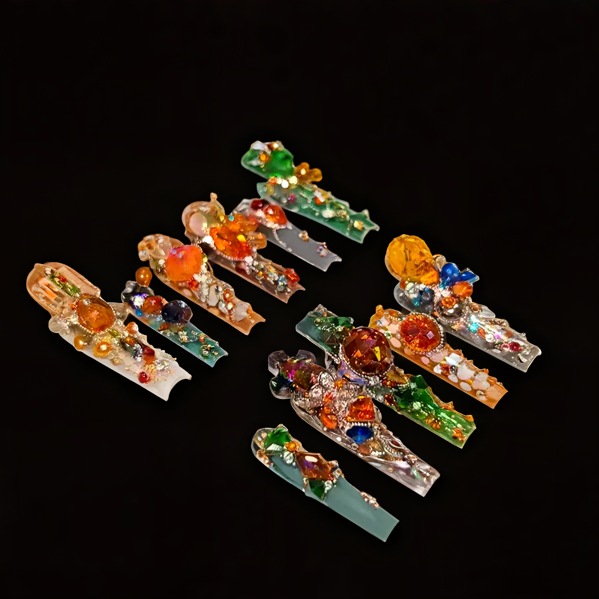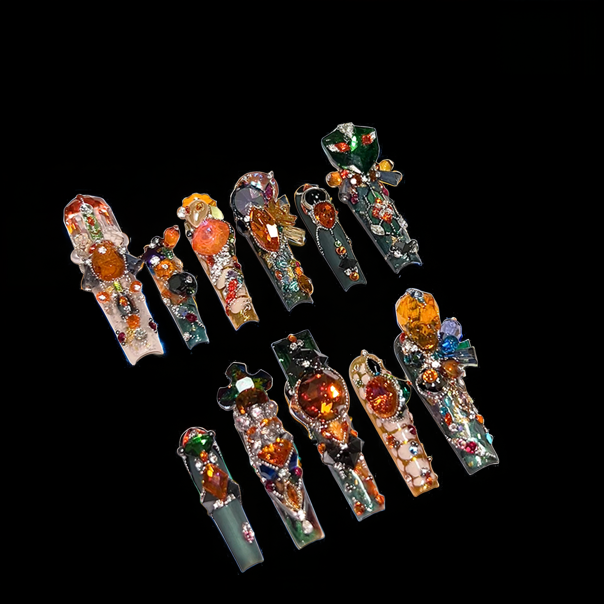 Unleash the mystique of transformation with Serpent Spell, an 11-piece luxury press-on nail set inspired by ancient totems and enchanted serpentine energy. Each tip is crowned with dazzling stones, fiery amber tones, and emerald scales — hand-set to evoke a sense of protective magic and opulence.
